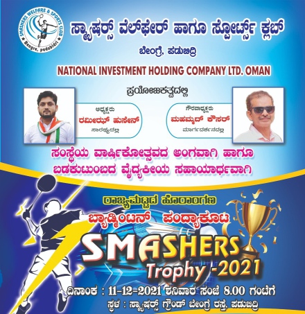 ಪಡುಬಿದ್ರಿ : ಸ್ಮ್ಯಾಷರ್ಸ್ ವೆಲ್ಫೇರ್ ಹಾಗೂ ಸ್ಪೋರ್ಟ್ಸ್ ಕ್ಲಬ್ ಬೇಂಗ್ರೆ ಪಡುಬಿದ್ರಿ, ನ್ಯಾಷನಲ್ ಇನ್ವೆಸ್ಟ್ಮೆಂಟ್ ಹೋಲ್ಡಿಂಗ್ ಕಂಪನಿ ಲಿ. ಒಮನ್ ಪ್ರಾಯೋಜಕತ್ವದಲ್ಲಿ ಅಧ್ಯಕ್ಷರಾದ ರಮೀಝ್ ಹುಸೇನ್ ಸಾರಥ್ಯದಲ್ಲಿ, ಗೌರವಾಧ್ಯಕ್ಷರಾದ ಮಹಮ್ಮದ್ ಕೌಸರ್ ಮಾರ್ಗದರ್ಶನದಲ್ಲಿ ಸಂಸ್ಥೆಯ ವಾರ್ಷಿಕೋತ್ಸವದ ಅಂಗವಾಗಿ ಹಾಗೂ ಬಡಕುಟುಂಬದ ವೈದ್ಯಕೀಯ ಸಹಾಯಾರ್ಥವಾಗಿ ರಾಜ್ಯಮಟ್ಟದ ಹೊರಾಂಗಣ ಬ್ಯಾಡ್ಮಿಂಟನ್ ಪಂದ್ಯಾಕೂಟ ಸ್ಮ್ಯಾಷಸ್೯ ಟ್ರೋಫಿ - 2021 ಡಿಸೆಂಬರ್ 11, ಶನಿವಾರ ಸಂಜೆ 8 ಗಂಟೆಗೆ ಪಡುಬಿದ್ರಿ ಬೇಂಗ್ರೆ ರಸ್ತೆಯ ಸ್ಮ್ಯಾಷರ್ಸ್ ಗೌಂಡ್ ಇಲ್ಲಿ ನಡೆಯಲಿದೆ.