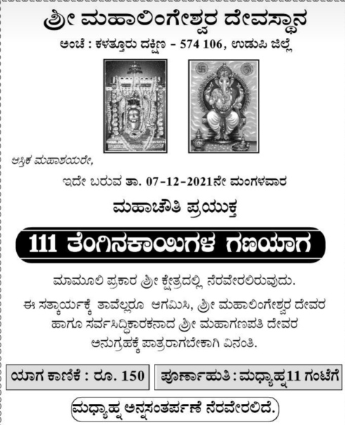 ಕಳತ್ತೂರು : ಮಹಾಚೌತಿ ಪ್ರಯುಕ್ತ 111 ತೆಂಗಿನಕಾಯಿಗಳ ಗಣಯಾಗ