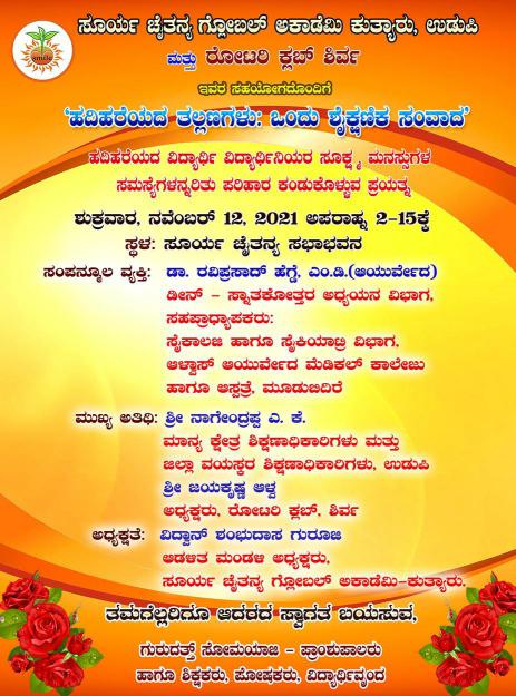 ನವೆಂಬರ್ 12 : ಸೂರ್ಯ ಚೈತನ್ಯ ಗ್ಲೋಬಲ್ ಅಕಾಡೆಮಿ ಕುತ್ಯಾರು ಮತ್ತು ರೋಟರಿ ಕ್ಲಬ್ ಶಿರ್ವ ಸಹಯೋಗದೊಂದಿಗೆ ಹದಿಹರೆಯದ ತಲ್ಲಣಗಳು: ಒಂದು ಶೈಕ್ಷಣಿಕ ಸಂವಾದ