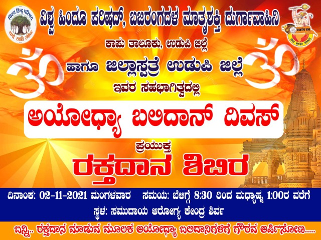 ನವೆಂಬರ್ 2 : ಅಯೋಧ್ಯಾ ಬಲಿದಾನ್ ದಿವಸ್ ಪ್ರಯುಕ್ತ ರಕ್ತದಾನ ಶಿಬಿರ