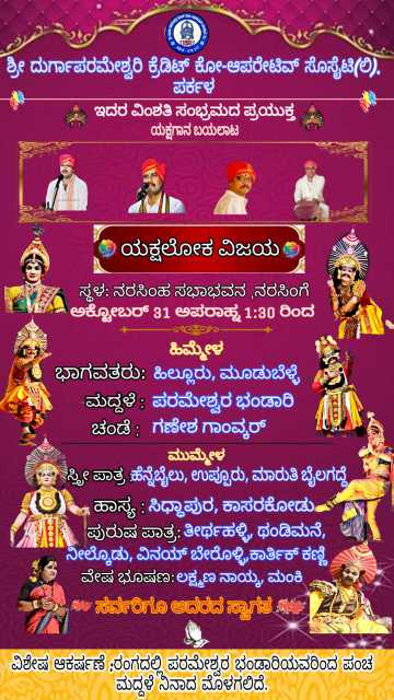 ಅಕ್ಟೋಬರ್ 31 : ದುರ್ಗಾಪರಮೇಶ್ವರಿ ಕ್ರೆಡಿಟ್ ಕೋ-ಆಪರೇಟಿವ್ ಸೊಸೈಟಿ ಪರ್ಕಳದ ವಿಂಶತಿ ಸಂಭ್ರಮದ ಪ್ರಯುಕ್ತ ಯಕ್ಷಗಾನ