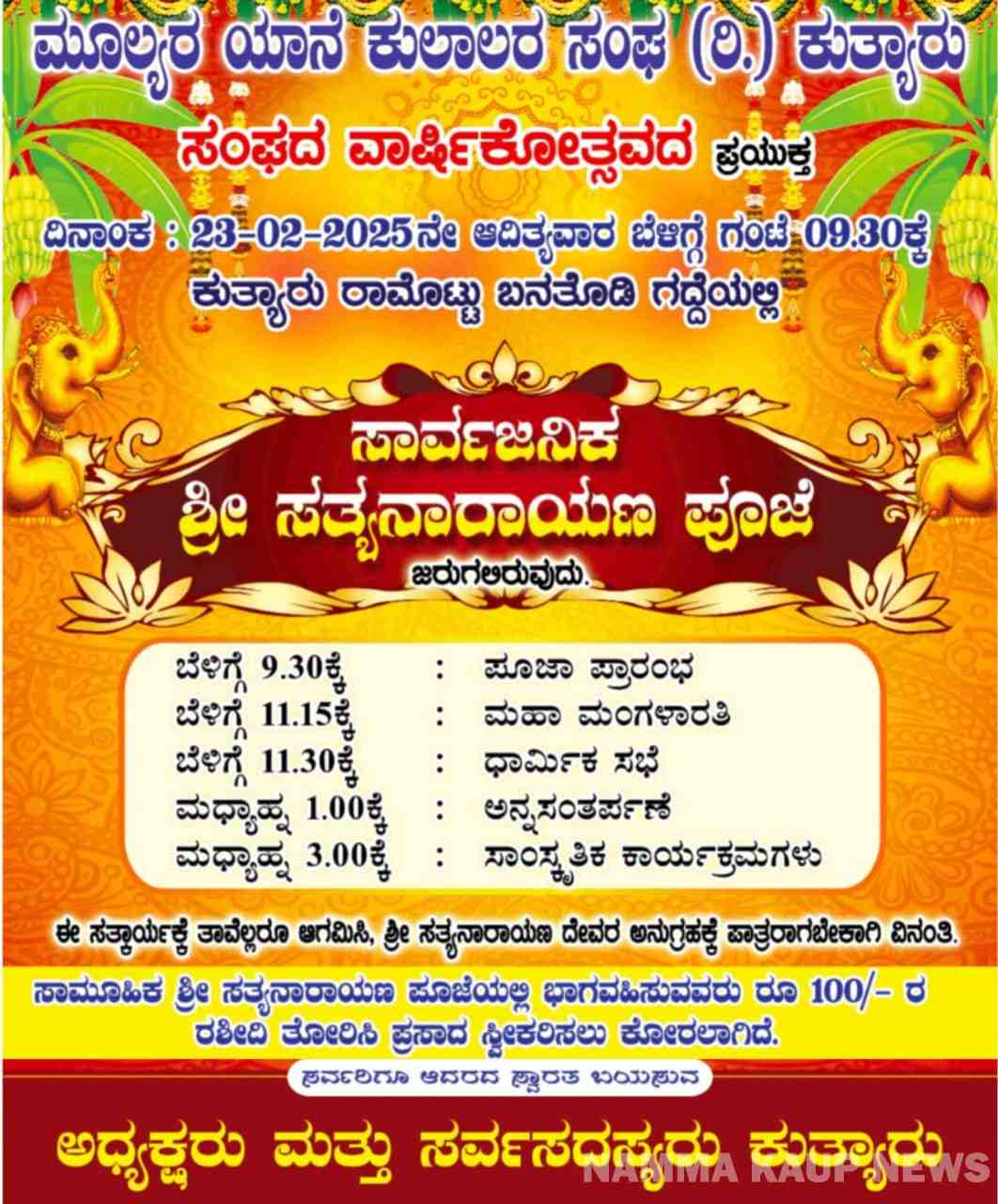 ಫೆ.23 : ಕುತ್ಯಾರು ಕುಲಾಲ ಸಂಘದ ವಾರ್ಷಿಕೋತ್ಸವ, ಸತ್ಯನಾರಾಯಣ ಪೂಜೆ ; ಸನ್ಮಾನ