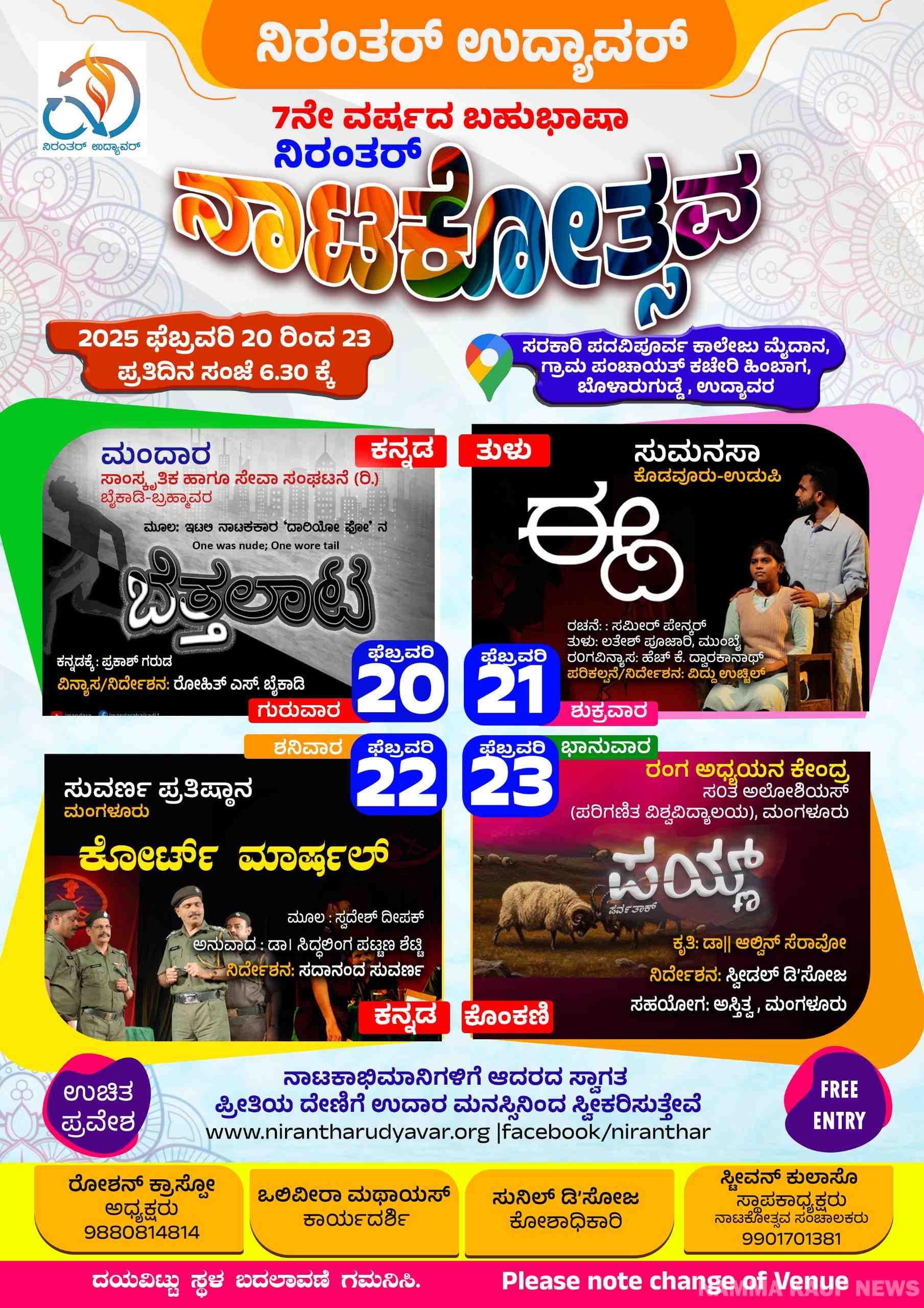 ಫೆ. 20-23 : ಉದ್ಯಾವರದಲ್ಲಿ ಏಳನೇ ವರ್ಷದ ನಿರಂತರ ಬಹುಭಾಷಾ ನಾಟಕೋತ್ಸವ
