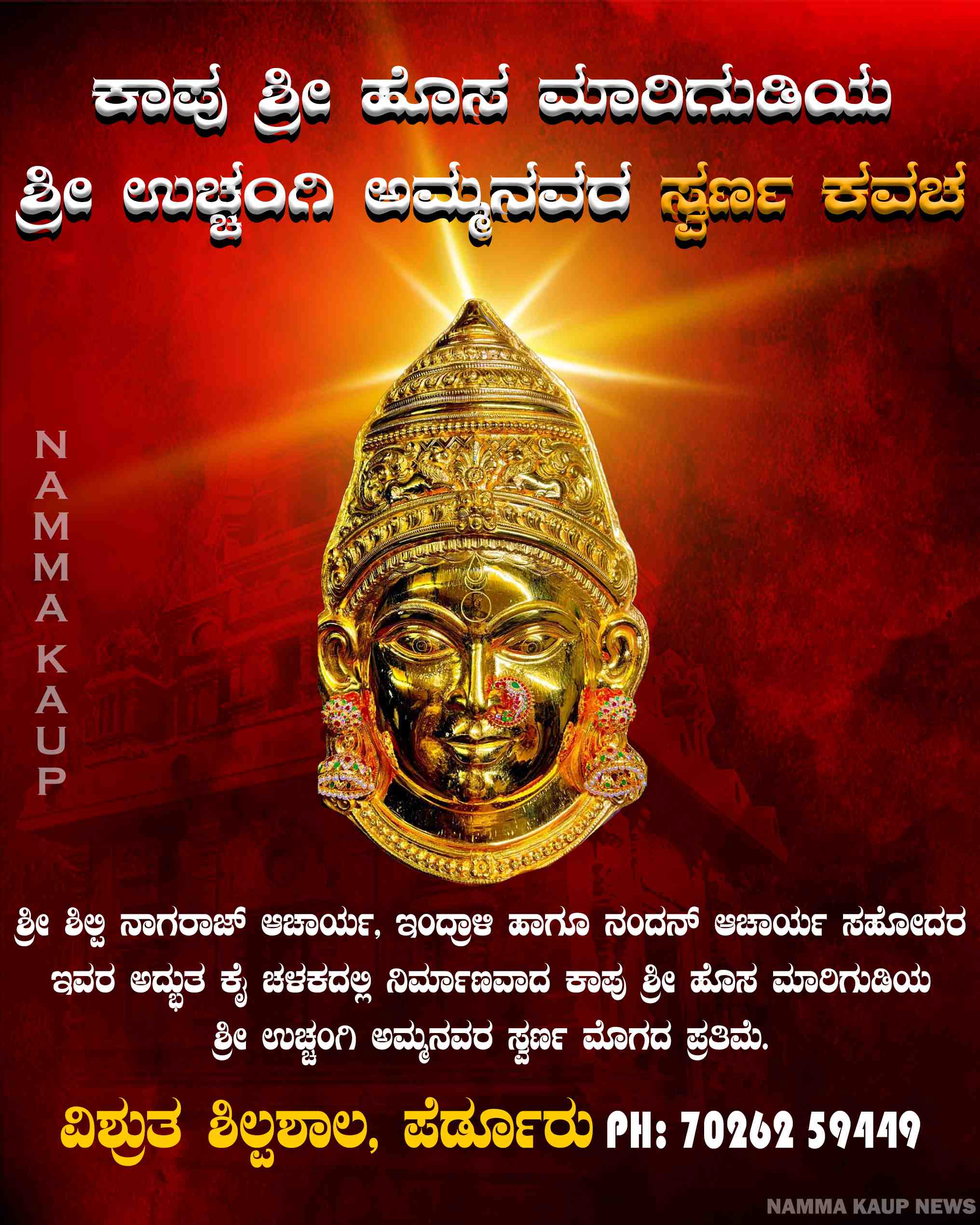 ಶ್ರೀ ಶಿಲ್ಪಿ ನಾಗರಾಜ್ ಆಚಾರ್ಯ, ಇಂದ್ರಾಳಿ ಹಾಗೂ ನಂದನ್ ಆಚಾರ್ಯ ಸಹೋದರ ಇವರ ಅದ್ಭುತ ಕೈ ಚಳಕದಲ್ಲಿ ನಿರ್ಮಾಣವಾದ ಕಾಪು ಶ್ರೀ ಹೊಸ ಮಾರಿಗುಡಿಯ ಶ್ರೀ ಉಚ್ಚಂಗಿ ಅಮ್ಮನವರ ಸ್ವರ್ಣ ಮೊಗದ ಪ್ರತಿಮೆ.