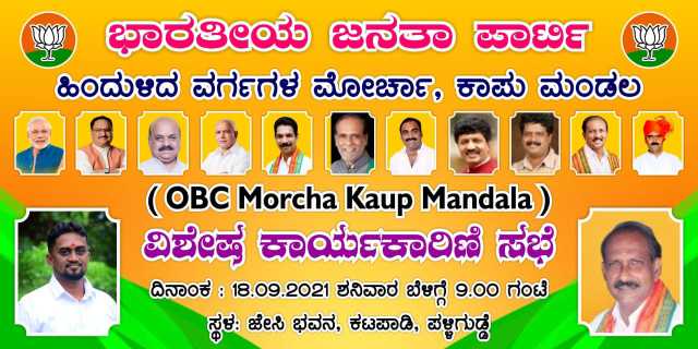 ಪ್ರಕಟನೆ : ಬಿಜೆಪಿ ಹಿಂದುಳಿದ ವರ್ಗಗಳ ಮೋರ್ಚಾ ಕಾಪು ಮಂಡಲ ವಿಶೇಷ ಕಾರ್ಯಕಾರಿಣಿ ಸಭೆ