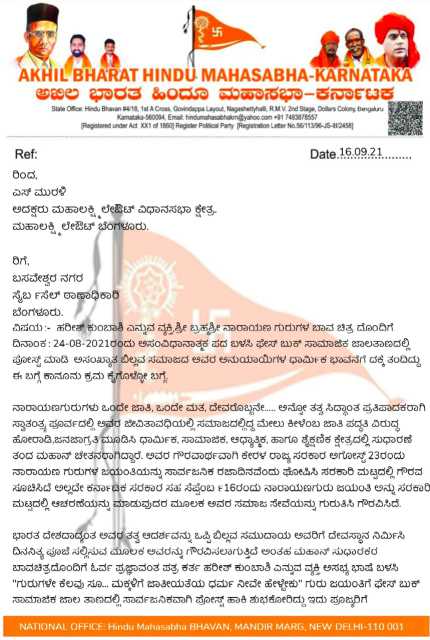 ಅಖಿಲ ಭಾರತ ಹಿಂದೂ ಮಹಾಸಭಾ-ಕರ್ನಾಟಕದಿಂದ ಫೇಸ್ಬುಕ್ ನಲ್ಲಿ ನಾರಾಯಣಗುರುಗಳ ಭಾವಚಿತ್ರದೊಂದಿಗೆ ಅಸಭ್ಯ ಭಾಷೆ ಬಳಸಿದ ಪತ್ರಕರ್ತನ ವಿರುದ್ಧ ದೂರು ದಾಖಲು
