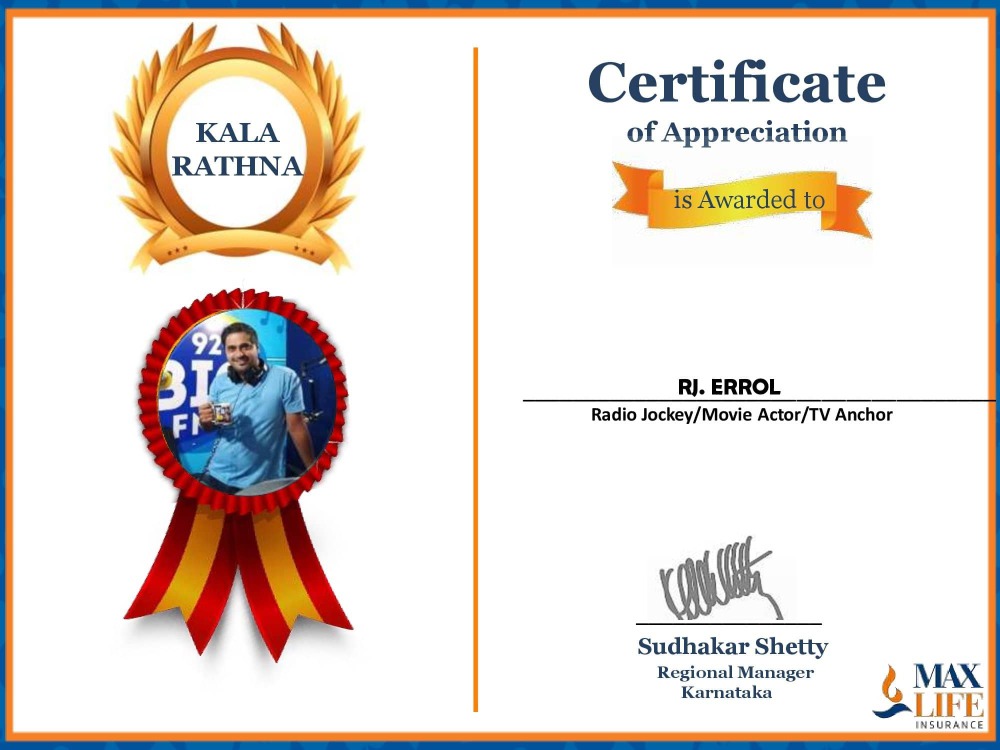ಕಾಪು : ಉಡುಪಿ ಜಿಲ್ಲೆಯ ಉದ್ಯಾವರ ಮೂಲದ ರೇಡಿಯೋ ಜಾಕಿ ಎರೋಲ್ ಗೆ MAXLIFE ಸಂಸ್ಥೆಯು ಕಲಾರತ್ನ ಗೌರವವನ್ನು ನೀಡಿ ಪುರಸ್ಕರಿಸಿದೆ.