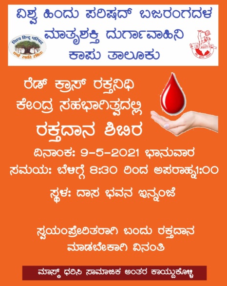 ಕಾಪು : ವಿಶ್ವ ಹಿಂದು ಪರಿಷದ್, ಬಜರಂಗದಳ, ಮಾತೃಶಕ್ತಿ ದುರ್ಗಾವಾಹಿನಿ ಕಾಪು ತಾಲೂಕು ಮತ್ತು ರೆಡ್ ಕ್ರಾಸ್ ರಕ್ತನಿಧಿ ಕೇಂದ್ರ ಸಹಭಾಗಿತ್ವದಲ್ಲಿ ರಕ್ತದಾನ ಶಿಬಿರವು ಮೇ 9, ಭಾನುವಾರ ಇನ್ನಂಜೆಯ ದಾಸ ಭವನದಲ್ಲಿ ನಡೆಯಲಿದೆ.