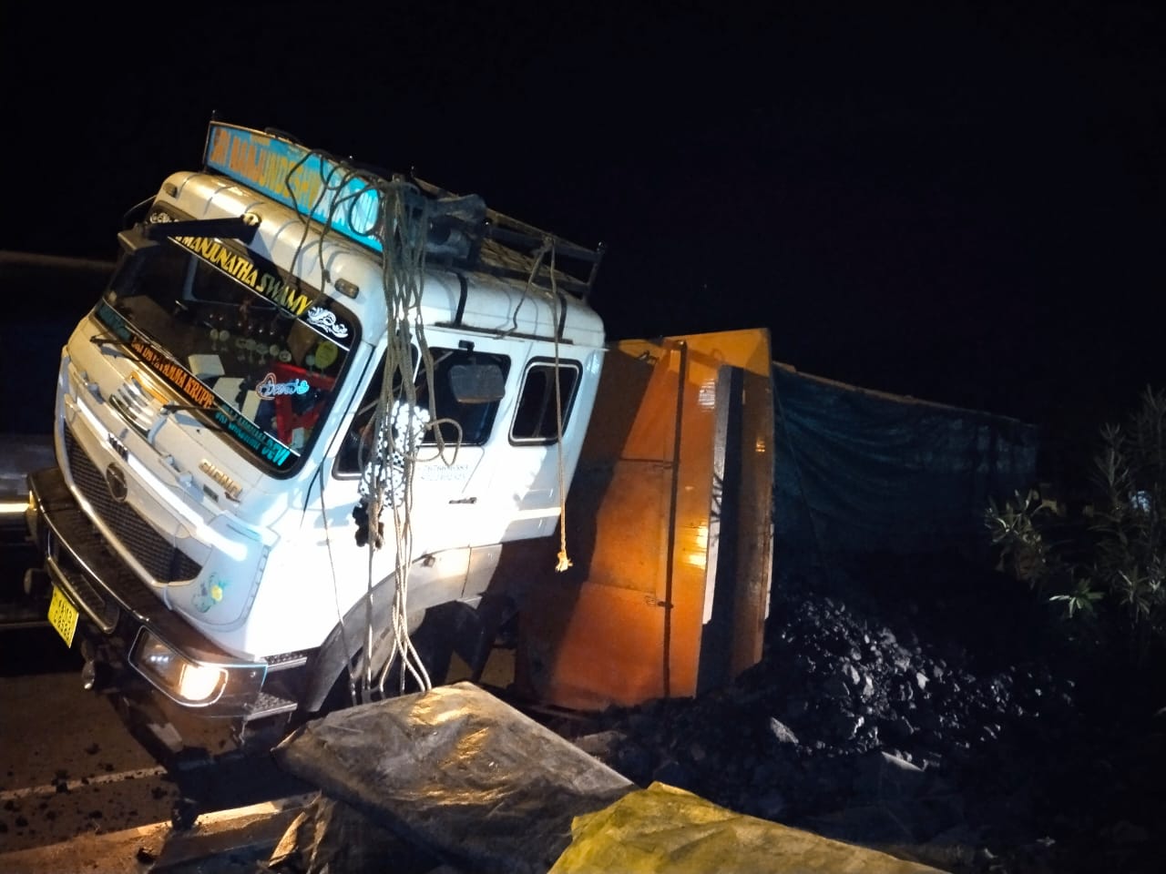 ಕಟಪಾಡಿಯಲ್ಲಿ ಮಗುಚಿದ ಗೂಡ್ಸ್ ಲಾರಿ ಹಿಂಭಾಗ - ನೆಲ ಪಾಲಾದ ಕಲ್ಲಿದ್ದಲು