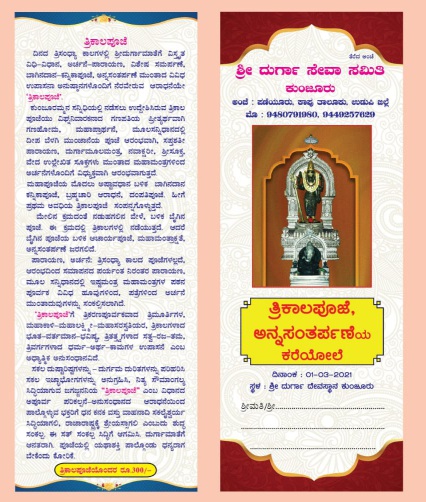ಕಾಪು ತಾಲೂಕಿನ ಶ್ರೀ ದುರ್ಗಾ ಸೇವಾ ಸಮಿತಿ ಕುಂಜೂರು ಇವರ ಮುಂದಾಳತ್ವದಲ್ಲಿ ಮಾರ್ಚ್ 1, ಸೋಮವಾರದಂದು ಶ್ರೀದುರ್ಗಾಮಾತೆಯ ಸನ್ನಿಧಿಯಲ್ಲಿ ದಿನದ ತ್ರಿಸಂಧ್ಯಾ ಕಾಲಗಳಲ್ಲಿ ಶ್ರೀ ದುರ್ಗಾಮಾತೆಗೆ ವಿಸ್ತೃತ ವಿಧಿ-ವಿಧಾನ, ಅರ್ಚನೆ-ಪಾರಾಯಣ, ವಿಶೇಷ ಸಮರ್ಪಣೆ, ಬಾಗಿನದಾನ-ಕನ್ನಿಕಾ ಪೂಜೆ, ಅನ್ನಸಂತರ್ಪಣೆ ಮುಂತಾದ ವಿವಿಧ ಉಪಾಸನಾ ಅನುಷ್ಠಾನಗಳೊಂದಿಗೆ ನೆರವೇರುವ ಆರಾಧನೆಯಾದ ತ್ರಿಕಾಲ ಪೂಜೆ ನಡೆಯಲಿದೆ. ಅದೇ ರೀತಿ ರಾತ್ರಿ ಅನ್ನಸಂತರ್ಪಣೆ ನಡೆಯಲಿದೆ ಎಂದು ಪ್ರಕಟನೆಯಲ್ಲಿ ತಿಳಿಸಿದ್ದಾರೆ.