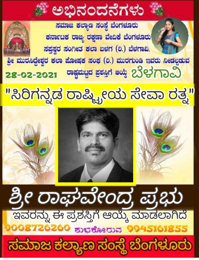 ಉಡುಪಿ : ಸಮಾಜ ಕಲ್ಯಾಣ ಸಂಸ್ಥೆ ಬೆಂಗಳೂರು, ಕನಾ೯ಟಕ ರಕ್ಷಣಾ ವೇದಿಕೆ' ಸಪ್ತಸ್ವರ ಸಂಗೀತ ಕಲಾ ಬಳಗ ಬೆಳಗಾವಿ ಮತ್ತು ಮರಳ ಸಿದ್ದೇಶ್ವರ ಕಲಾ ಪೋಷಕ ಸಂಘ ವತಿಯಿoದ ಫೆ.28 ರಂದು ಬೆಳಗಾವಿಯಲ್ಲಿ ನಡೆಯುವ ರಾಷ್ಟ್ರೀಯ ಕಲಾ ಉತ್ಸವ -2021 ಕಾಯ೯ಕ್ರಮದಲ್ಲಿ ಸಾಧಕರಿಗೆ ಗೌರವ ವಿಭಾಗದಲ್ಲಿ ಉಡುಪಿ ಜಿಲ್ಲೆಯ ರಾಘವೇಂದ್ರ ಪ್ರಭು,ಕವಾ೯ಲು ರವರು ಸಿರಿಗನ್ನಡ ರಾಷ್ಟ್ರೀಯ ಸೇವಾ ರತ್ನ ಪ್ರಶಸ್ತಿ ಗೆ ಆಯ್ಕೆಯಾಗಿದ್ದಾರೆ. ಸ್ವಚ್ಚ ಭಾರತ್ ಫ್ರ್oಡ್ಸ್ ಸಂಯೋಜಕರಾಗಿರುವ ಇವರು ಸಮಾಜಮುಖಿ ಕಾಯ೯ಗಳಲ್ಲಿ ತೊಡಗಿಸಿಕೊಂಡಿದ್ದಾರೆ.