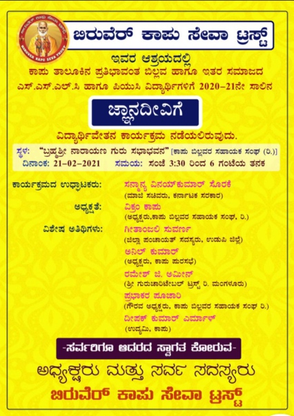 ಕಾಪು ತಾಲೂಕಿನ ಪ್ರತಿಭಾವಂತ ಬಿಲ್ಲವ ಹಾಗೂ ಇತರ ಸಮಾಜದ ಎಸ್.ಎಸ್.ಎಲ್.ಸಿ ಹಾಗೂ ಪಿ.ಯು.ಸಿ ವಿದ್ಯಾರ್ಥಿಗಳಿಗೆ 2020 -21 ನೇ ಸಾಲಿನ ಜ್ಞಾನದೀವಿಗೆ ವಿದ್ಯಾರ್ಥಿವೇತನ ಕಾರ್ಯಕ್ರಮವು ಬಿರುವೆರ್ ಕಾಪು ಸೇವಾ ಟ್ರಸ್ಟ್ ಇವರ ಆಶ್ರಯದಲ್ಲಿ ಕಾಪು ಬಿಲ್ಲವರ ಸಹಾಯಕ ಸಂಘ (ರಿ.) ಇದರ ಬ್ರಹ್ಮಶ್ರೀ ನಾರಾಯಣಗುರು ಸಭಾಭವನದಲ್ಲಿ ಫೆಬ್ರವರಿ 21, ಆದಿತ್ಯವಾರ ಸಂಜೆ 3.30 ರಿಂದ 6 ಗಂಟೆಯ ತನಕ ನಡೆಯಲಿದೆ.