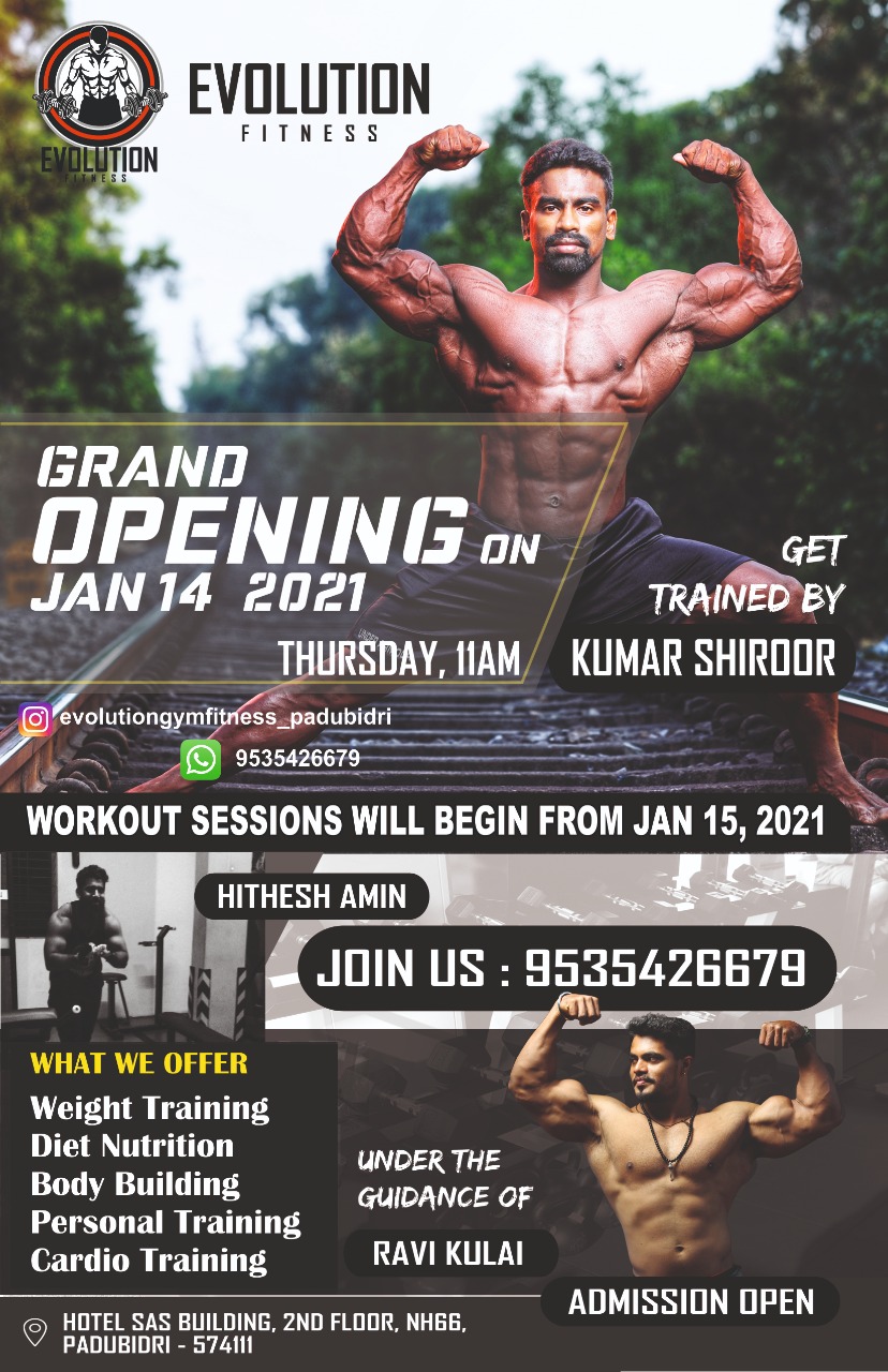 ಎವಲ್ಯೂಷನ್ ಜಿಮ್ ಆಂಡ್ ಫಿಟ್ನೆಸ್ ಇದರ ಎರಡನೇ ಶಾಖೆ ಪಡುಬಿದ್ರಿ ರಾಷ್ಟ್ರೀಯ ಹೆದ್ದಾರಿಯ ಸಾಸ್ ಬಿಲ್ಡಿಂಗ್ ನ 2ನೇ ಮಹಡಿಯಲ್ಲಿ ಇದೇ ಬರುವ ಗುರುವಾರ ಬೆಳಗ್ಗೆ 11 ಗಂಟೆಗೆ ಶುಭಾರಂಭಗೊಳ್ಳಲಿದೆ.