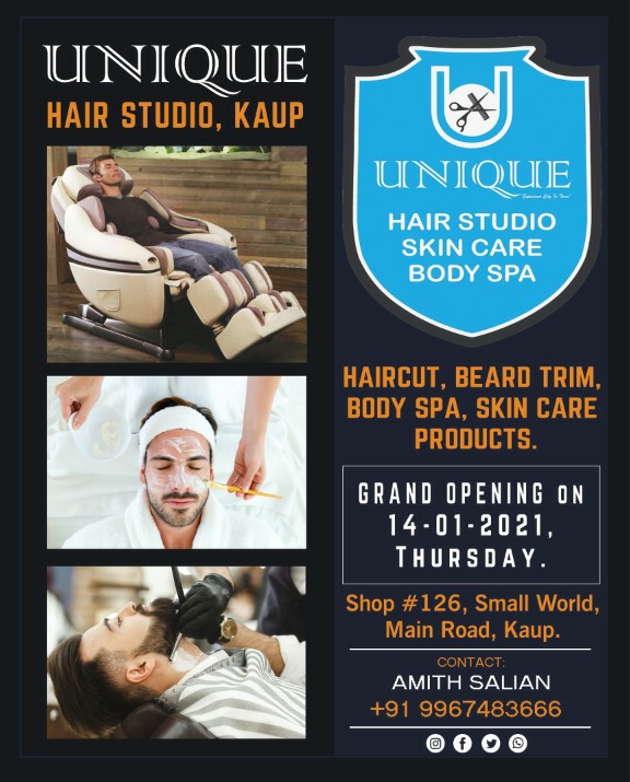 ಕಾಪು ಮುಖ್ಯರಸ್ತೆಯಲ್ಲಿರುವ ಸ್ಮಾಲ್ ವರ್ಲ್ಡ್ ಕಟ್ಟಡದ ಶಾಪ್ ನಂ #126 ರಲ್ಲಿ ಇದೇ ಬರುವ ಜನವರಿ 14 ರಂದು ಯೂನಿಕ್ ಹೇರ್ ಸ್ಟೂಡಿಯೋ ಶುಭಾರಂಭಗೊಳ್ಳಲಿದೆ.