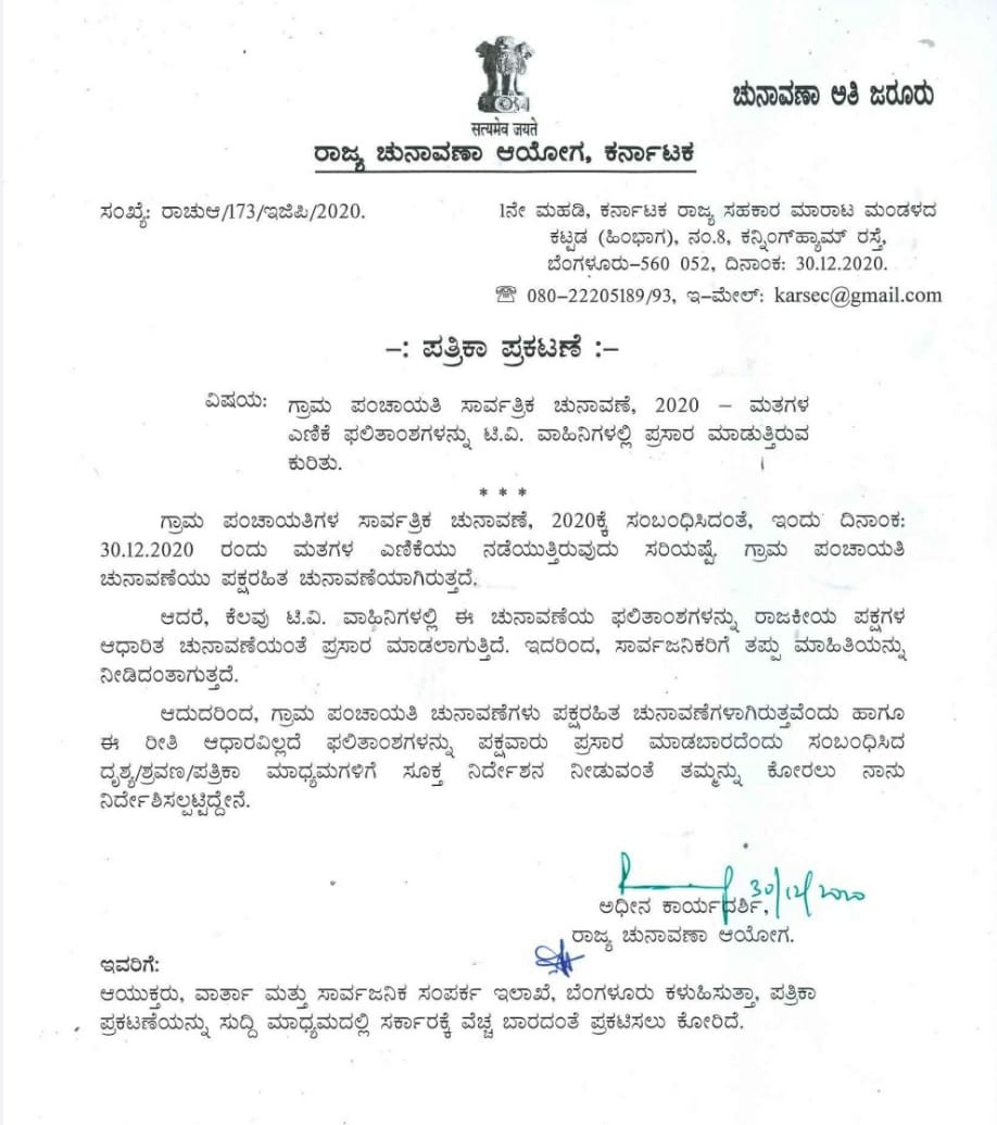 ಗ್ರಾಮ ಪಂಚಾಯತ್ ಚುನಾವಣೆಯು ಪಕ್ಷರಹಿತ ಚುನಾವಣೆಯಾಗಿದ್ದು ಟಿ.ವಿ ವಾಹಿಗಳಲ್ಲಿ ಪಕ್ಷಬಿಂಬಿತವಾಗುತ್ತಿದ್ದು ಇದು ಸಾರ್ವಜನಿಕರಿಗೆ ತಪ್ಪು ಮಾಹಿತಿ ನೀಡುತ್ತಿರುವ ಬಗ್ಗೆ ರಾಜ್ಯ ಚುನಾವಣಾ ಆಯೋಗ ಪತ್ರಿಕಾ ಪ್ರಕಟನೆಯಲ್ಲಿ ತಿಳಿಸಿದ್ದಾರೆ.