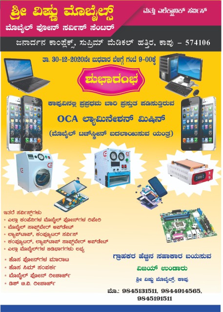 ಕಾಪು ಸುಪ್ರಿಮ್ ಮೆಡಿಕಲ್ ಹತ್ತಿರದ ಜನಾರ್ದನ ಕಾಂಪ್ಲೆಕ್ಸ್ ನಲ್ಲಿ ನೂತನ ಶ್ರೀ ವಿಷ್ಣು ಮೊಬೈಲ್ಸ್ ಮೊಬೈಲ್ ಫೋನ್ ಸರ್ವಿಸ್ ಮತ್ತು ಎಲೆಕ್ಟ್ರಾನಿಕ್ ಸರ್ವಿಸ್ ಸೆಂಟರ್ ನಾಳೆ ಬೆಳಿಗ್ಗೆ 9 ಗಂಟೆಗೆ ಶುಭಾರಂಭಗೊಳ್ಳಲಿದೆ.