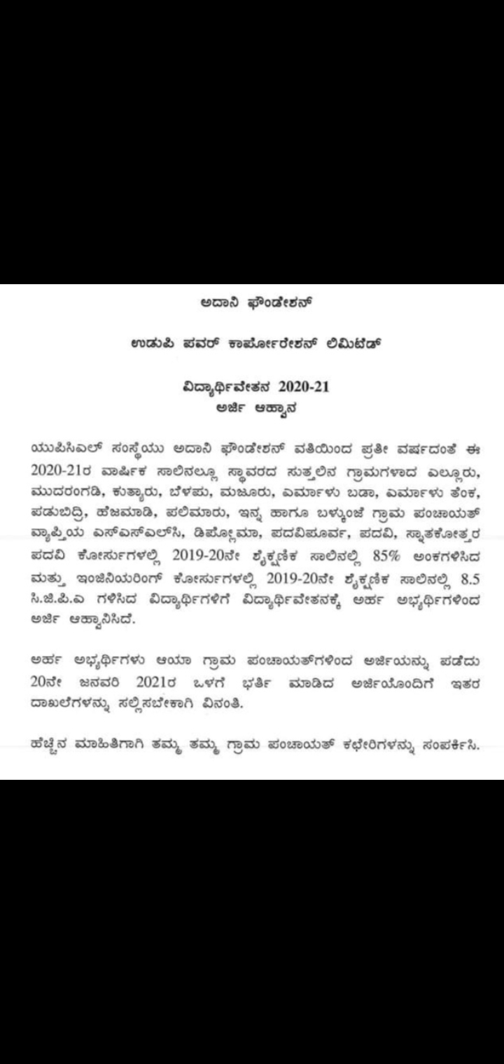 ಅದಾನಿ ಫೌಂಡೇಶನ್ ಉಡುಪಿ ಪವರ್ ಕಾರ್ಪೋರೇಶನ್ ಲಿಮಿಟೆಡ್ ಇದರ ವಿದ್ಯಾರ್ಥಿವೇತನ ದ 2020-21 ನೇ ಸಾಲಿನ ಅರ್ಜಿ ಆಹ್ವಾನ