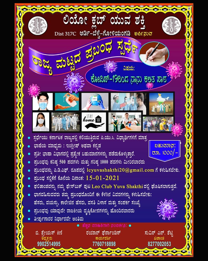 ಲಿಯೋ ಕ್ಲಬ್ ಯುವ ಶಕ್ತಿ Dist 317C ಆರ್ಡಿ-ಬೆಳ್ವೆ-ಗೋಳಿಯಂಗಡಿ ಅರ್ಪಿಸುವ ರಾಜ್ಯ ಮಟ್ಟದ ಕೋವಿಡ್ -19ರಿಂದ ನಾನು ಕಲಿತ ಪಾಠ (Lesson I learnt from covid -19) ಎಂಬ ವಿಷಯದ ಪ್ರಬಂಧ ಸ್ಪರ್ಧೆಯು ಕರ್ನಾಟಕ ರಾಜ್ಯದಲ್ಲಿ ಕಲಿಯುತ್ತಿರುವ ಪಿಯುಸಿ ವಿದ್ಯಾರ್ಥಿಗಳಿಗೆ ಮಾತ್ರವಾಗಿದೆ. ಕನ್ನಡ ಮತ್ತು ಇಂಗ್ಲಿಷ್ ಮಾಧ್ಯಮದಲ್ಲಿ ಇದ್ದು, ಪ್ರತಿ ಭಾಷಾ ವಿಭಾಗದಲ್ಲಿ ಎರಡು ಬಹುಮಾನಗಳಿವೆ, ತೀರ್ಪುಗಾರರ ನಿರ್ಧಾರ ಅಂತಿಮವಾಗಿರುತ್ತದೆ. ಪ್ರಬಂಧದಲ್ಲಿ ಕನಿಷ್ಠ 500 ಪದಗಳು ಮತ್ತು ಗರಿಷ್ಠ 1000 ಪದಗಳು ಇರಬೇಕು. ಪ್ರಬಂಧವನ್ನು ಪಿಡಿಎಫ್ ರೂಪದಲ್ಲಿ lcyuvashakthi20@gmail.com ಗೆ ಕಳುಹಿಸಬೇಕು.