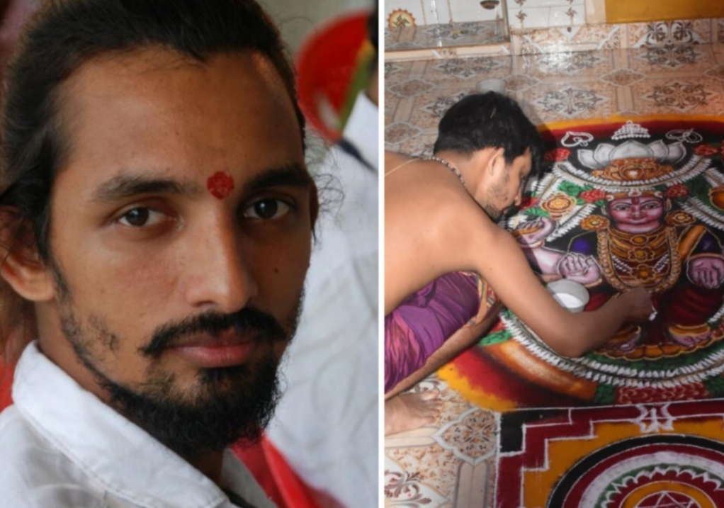 ರಂಗವಲ್ಲಿಯಲ್ಲಿ ದೇವರ ಚಿತ್ರವ ಮೂಡಿಸುವ ಕಲಾಕಾರ ಹರೀಶ್ ಶಾಂತಿ