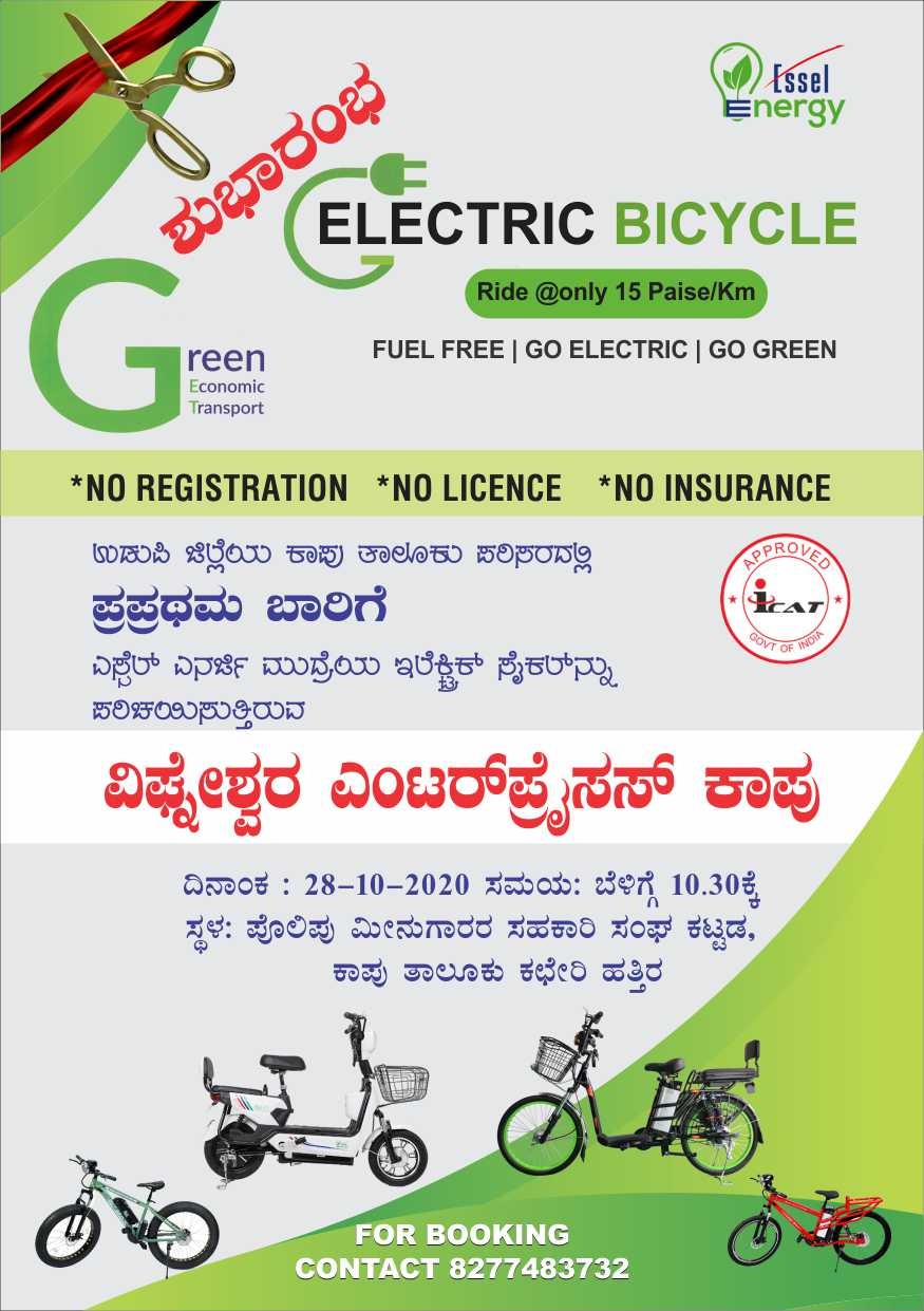 ಮಾಲಿನ್ಯಮುಕ್ತ ಪರಿಸರವನ್ನು ಪೋಷಿಸುವ ದಿಸೆಯಲ್ಲಿ ಯಾವುದೇ ದಾಖಲಾತಿ, ಲೈಸೆನ್ಸ್, ಇನ್ಶೂರೆನ್ಸ್ ನ ಅಗತ್ಯವಿಲ್ಲದ ಇಲೆಕ್ಟ್ರಿಕಲ್ ಸೈಕಲ್ ಶೋರೂಮ್ ಪ್ರಪ್ರಥಮ ಬಾರಿಗೆ ಉಡುಪಿ ಜಿಲ್ಲೆಯ ಕಾಪು ತಾಲೂಕಿನ ಪೊಲಿಪು ಮೀನುಗಾರರ ಸಹಕಾರಿ ಸಂಘ, ಕಾಪು ತಾಲೂಕು ಕಛೇರಿ ಹತ್ತಿರದ ವಿಘ್ನೇಶ್ವರ ಎಂಟರ್ಪ್ರೈಸಸ್ ಕಾಪು ಇಲ್ಲಿ ನಾಳೆ (28-10-20) ಬೆಳಿಗ್ಗೆ 10:30ಕ್ಕೆ ಶುಭಾರಂಭಗೊಳ್ಳಲಿದೆ. ಹೆಚ್ಚಿನ ಮಾಹಿತಿಗಾಗಿ ಸಂಪರ್ಕಿಸಿ ಸುಧಾಕರ್ ಬಂಗೇರ : 8277483732