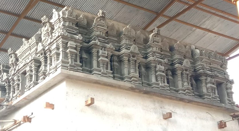 ಗಜಪೃಷ್ಠಾಕಾರದ ಗರ್ಭಗುಡಿಯ ನಿರ್ಮಾಣ ನಡೆಯುತ್ತಿದ್ದು ಪ್ರತಿಬಂಧ ಕ್ರಮದ ಅಧಿಷ್ಠಾನ , ಭಿತ್ತಿ ಸ್ತಂಭ - ಪಂಜರ - ಘನದ್ವಾರ - ಉತ್ತರವಲ್ಲಭೀಕಪೋತ ಮುಂತಾದ ಶಾಸ್ತ್ರೀಯ ನಿರ್ಮಿತಿಗಳಿಂದ ಭಿತ್ತಿಯು ಸ್ದಿದ್ಧಗೊಂಡಿದೆ .ಈಗ ಗ್ರೀವದಲ್ಲಿ ( ಪ್ರಸ್ತರ ಮತ್ತು ಸ್ತೂಪಿಯ ಎರಡು ಛಾವಣಿಯ ಮಧ್ಯದ ಸ್ಥಳಾವಕಾಶ) ಇಟ್ಟಿಗೆ , ಸಿಮೆಂಟ್ ಬಳಸಿ ಅಸಾಧಾರಣ ಕುಸುರಿನ ಕಲೆಯ ಕೌಶಲ್ಯ ಪಡಿಮೂಡುತ್ತಿವೆ.