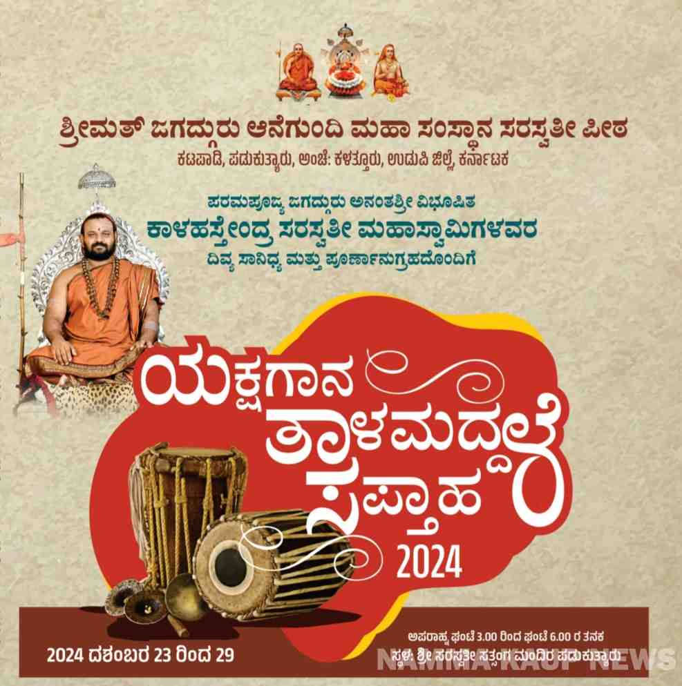 ಶಿರ್ವ : ಪಡುಕುತ್ಯಾರಿನಲ್ಲಿರುವ ಕಟಪಾಡಿ ಶ್ರೀಮತ್ ಜಗದ್ಗುರು ಆನೆಗುಂದಿ ಮಹಾಸಂಸ್ಥಾನ ಸರಸ್ವತೀ ಪೀಠದಲ್ಲಿ ಡಿಸೆಂಬರ್ 23ರಿಂದ 29ತನಕ ಯಕ್ಷಗಾನ ತಾಳಮದ್ದಳೆ ಸಪ್ತಾಹ 2024 ನಡೆಯಲಿದೆ.