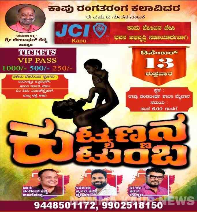 ಡಿ.13 : ಕಾಪು ದಂಡತೀರ್ಥ ಶಾಲಾ ಮೈದಾನದಲ್ಲಿ ಕುಟ್ಯಣ್ಣನ ಕುಟುಂಬ ತುಳು ನೂತನ ನಾಟಕ ಪ್ರದರ್ಶನ