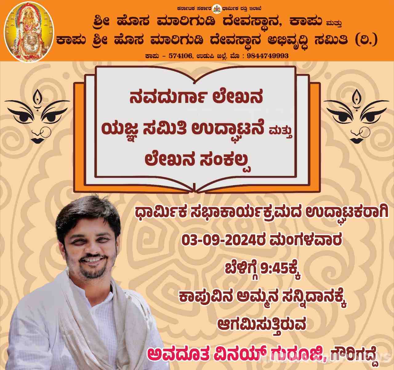 ನಾಳೆ (ಸೆ. 3) : ಕಾಪು ಹೊಸ ಮಾರಿಗುಡಿಯಲ್ಲಿ ನವದುರ್ಗಾ ಲೇಖನ ಯಜ್ಞ ಸಮಿತಿ ಉದ್ಘಾಟನೆ ಮತ್ತು ಲೇಖನ ಸಂಕಲ್ಪ