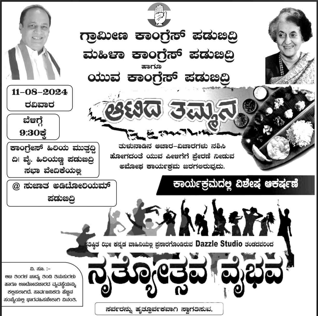 ಆಗಸ್ಟ್ 11 : ಪಡುಬಿದ್ರಿಯಲ್ಲಿ ಕಾಂಗ್ರೆಸ್ ಪಕ್ಷದ ವತಿಯಿಂದ ಆಟಿದ ತಮ್ಮನ