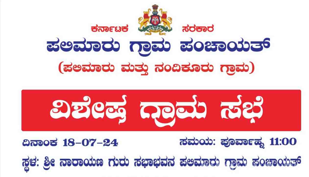 ಪಲಿಮಾರು : ಇಲ್ಲಿನ ಗ್ರಾಮ ಪಂಚಾಯತ್ ನ ವಿಶೇಷ ಗ್ರಾಮ ಸಭೆ ಜುಲೈ 18 ರಂದು ಪೂರ್ವಾಹ್ನ ಗಂಟೆ 11ಕ್ಕೆ ಪಲಿಮಾರು ಗ್ರಾಮ ಪಂಚಾಯತ್ ನ ಶ್ರೀ ನಾರಾಯಣ ಗುರು ಸಭಾಭವನದಲ್ಲಿ ಜರಗಲಿದೆ ಎಂದು ಪ್ರಕಟಣೆಯಲ್ಲಿ ತಿಳಿಸಿದ್ದಾರೆ.