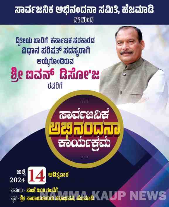 ಹೆಜಮಾಡಿ : ದ್ವಿತೀಯ ಬಾರಿಗೆ ಕರ್ನಾಟಕ ಸರಕಾರದ ವಿಧಾನಪರಿಷತ್ ಸದಸ್ಯರಾಗಿ ಅಯ್ಕೆಯಾದ ಐವನ್ ಡಿಸೋಜರವರಿಗೆ ಸಾರ್ವಜನಿಕ ಅಭಿನಂದನಾ ಕಾರ್ಯಕ್ರಮವನ್ನು ಜುಲೈ 14, ಆದಿತ್ಯವಾರ ಸಂಜೆ 4 ಗಂಟೆಗೆ ಹೆಜಮಾಡಿ ನಾರಾಯಣಗುರು ಸಭಾಭವನದಲ್ಲಿ ಹಮ್ಮಿಕೊಳ್ಳಲಾಗಿದೆ.